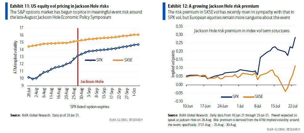 上面兩張圖,也是衍生品市場的,左圖是歐州市場指數平價期權隱含波動率結構曲線:黃色,可以忽略,看藍色標普指數平價期權的隱含波動率走勢,剛好也是在8月25號後波動率有明顯擡升,這其實就是市場在對即將轉鷹的傑克遜霍爾會議做波動率的計價。