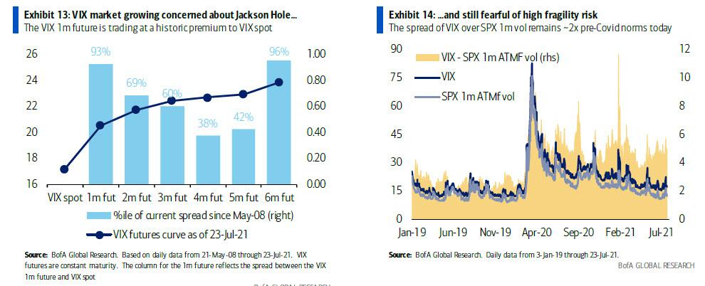 左圖顯示了目前VIX指數期貨1月間隔的價格結構曲線,從現在開始,1mfut也就是一個月後的期貨價格環比增幅最大,可預見8月份的傑克遜霍爾會前後會有一場大波動出現,這是期貨市場押注的走勢。