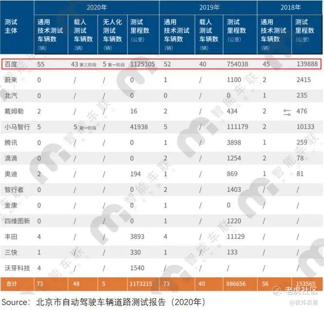 技術層面而言,據2020年北京車輛測試報告,百度在通用技術測試車輛數,載人測試車輛數,無人化測試車輛數和測試里程數,都保持領先。