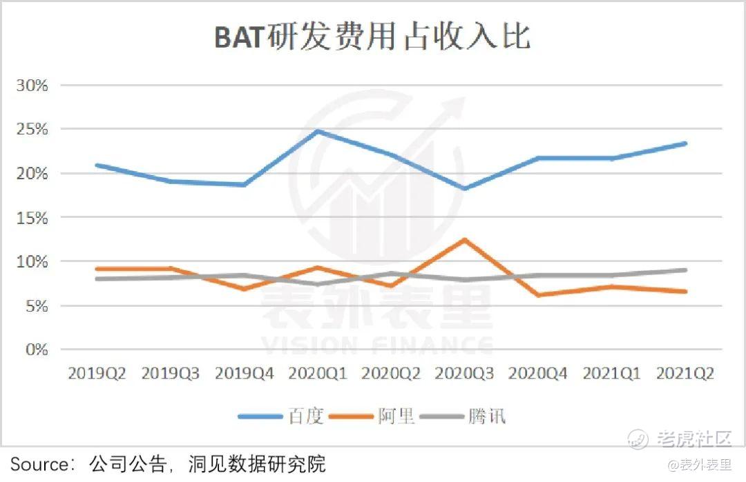 如下圖,2021Q2百度研發費用佔收入比,大幅增加;相比之下,阿里的研發費用佔收入比則有所下調。