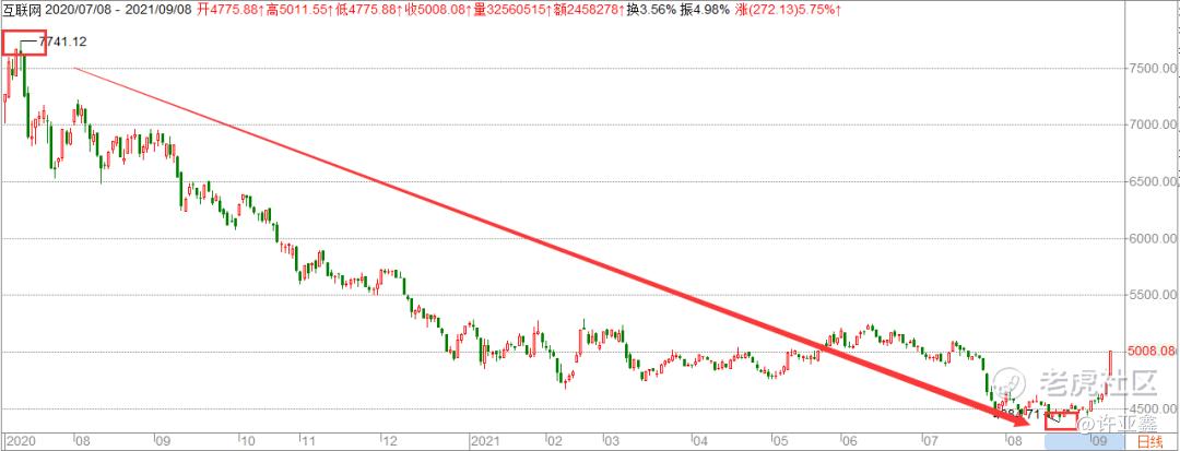 如上圖所示,互聯網行業日內以5.75%的漲幅高居榜首。事實上,從去年7月的高位回落,時間上已經整整調整了1年,空間上跌去了40%+,纔有了我們近幾個交易日看到的所謂的“暴力”反彈。