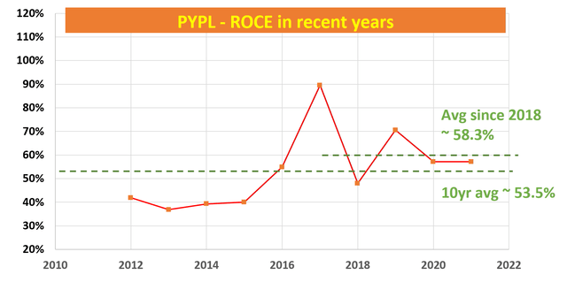 As seen below, PYPL was able to maintain a remarkably high and stable ROCE over the long term (on average 53.5% for the past decade). The ROCE has been even higher in recent years, on average 58.3% since 2018. In this analysis, I considered the following items as capital actually employed 1) Working capital, including payables, receivables, inventory, 2) Gross Property, Plant, and Equipment, and 3) research and development expenses as also capitalized.