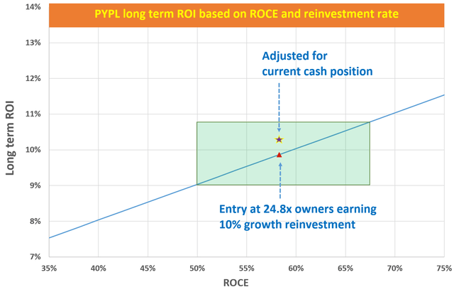 Finally, note that there is about $8.6 of net cash behind each PYPL share (taken as total current assets minus total long-term debt). Adjusted for the net cash position, PYPL's OEY will be a bit higher, about 4.4%. and this adjustment will push the total long-term return into double-digit range (about 10.2%).