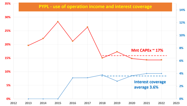 As seen, to start, PYPL is essentially debt-free. Its interest coverage (defined as EBIT earnings divided by interest expenses) has been on average about 28x. It only takes about 3.6% of its EBIT earnings to service its debt. Second, it has been using on average only ~17% of its OPC (operation cash) as maintenance CAPEX expenses. It does not pay a dividend. So this is it - these are ALL the mandatory expenses for PYPL.