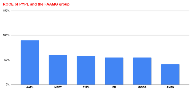 And you will see next that PayPal (NASDAQ:PYPL) is a stock that demonstrates both high ROCE and enviable capital allocation flexibility. Its ROCE is competitive even when compared to the overachieving FAAMG group. Also, note that even for such ideal compounders, the grandmaster still cautions us not to leave the question of price aside. The recent market correction has burst the valuation bubble for PYPL and offered a reasonable entry opportunity.