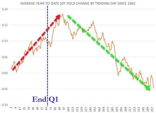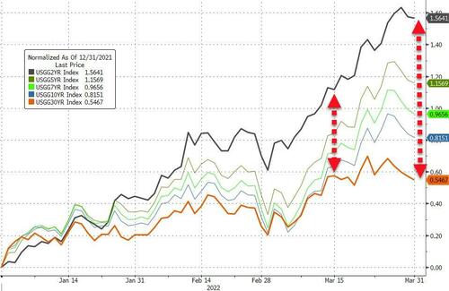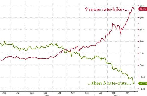 The bond market have fallen all the way in the first quarter. Thursday marked the official end of the first quarter, just as the global bond market just suffered its biggest quarterly drop on record, according to data compiled by Bloomberg.In terms of U.S. bonds,according to statistics from Jim Reid, head of special research at Deutsche Bank,the 10-year U.S. Treasury recorded one of the worst quarterly performances in total returns in the past 157 years (since the American Civil War),In the Q1, 2022, 2-year U.S. Treasury yields surged 156 basis points, the largest quarterly gain in nearly 40 years.In contrast, the rise in long-term bond yields, while impressive historically, is still far less impressive: 30-year yields are up "only" 55 basis points.This directly caused the key 2-year/10-year Treasury yield curve to invert at the end of March. This inversion of the yield curve is often seen by the industry as a reliable indicator of a recession in the U.S. economy within one to two years.At present, U.S. bond yields have finally caught up with Gundlach’s favorite forward-looking indicator (copper/gold ratio):Seasonally speaking, before the trend really turns bullish on bonds (the chart below shows the typical seasonal pattern of 10-year U.S. Treasury yields since 1962), we may see more pain in the bond market...Logically, the series of sell-offs and inversions of U.S. bonds are not unrelated to the market’s interest rate expectations from the Federal Reserve.At present, the interest rate swap market expects the Fed to raise interest rates by 25 basis points nine times this year, and may cut interest rates three times in the next two years!