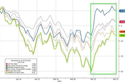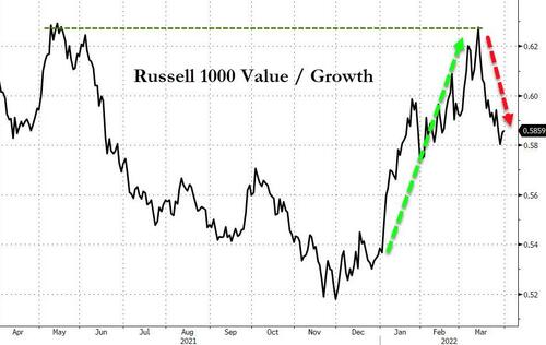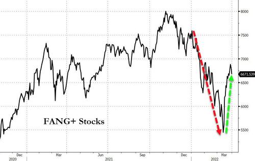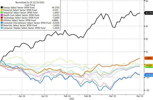 Although global stock markets generally rebounded in the second half of March, the stock indexes of major economies are still difficult to escape the fate of falling. As of the end of the first quarter, the S&P 500 fell 4.3%, the pan-European Stoxx 600 fell 6.5%, and the Shanghai Composite fell more than 10% in three months.On the U.S. stock market, the Dow Jones Transportation Average ended the first quarter almost flat where it started the year, while the Nasdaq Composite fell about 8% in the first quarter despite a sharp rise in March. It was the index's second-worst start to a start since 2008 (after the start of the Covid-19 outbreak in 2020).In terms of the magnitude of the rebound, after bottoming in mid-March, the Nasdaq has rallied a staggering 17% in just 10 days, while the S&P 500 has risen nearly 12% over the same period.From the perspective of specific industry sectors, energy stocks were the biggest winners in the US stock market in the first quarter, while utilities stocks were the only other sectors that rose. In contrast, consumer discretionary and technology stocks were the worst performers in the quarter.Meanwhile, value stocks generally outperformed growth stocks in the first quarter, but growth stocks are starting to buck the trend in the near term after relative performance hit its highest point since May 2021 in March.FANG+, a group of large tech stocks, rebounded sharply in late March, but still closed the first quarter lower.