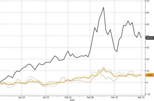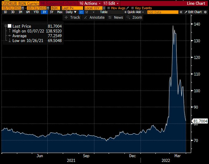 In FX markets, the Bloomberg Dollar Index was higher in the first quarter (up in January and March, down in February), returning to its pre-COVID-19 range and now at its highest monthly close since July 2020… …The most dramatic change in the foreign exchange market in Q1 undoubtedly appeared in the ruble, the protagonist of the conflict between Russia and Ukraine. Due to the Western sanctions against Russia, the Russian ruble fell to a low of nearly 140 rubles against the US dollar in early March, but now it has returned to the 80 before the outbreak of the Russian-Ukrainian conflict under a series of measures to support the exchange rate from Russia. level near the pass.