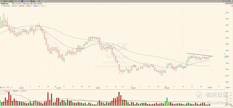 TaskUs ($$(TASK)$) stays well above the EMA21 in a constructive consolidation. If the price goes above the black line, the trade might work. Stop Loss at yesterday's low.