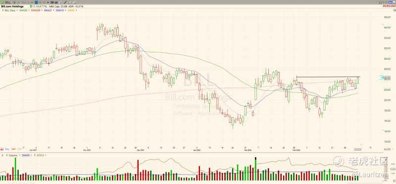 Bill ($$(BILL)$) is forming a cup and handle, ATR declining, low volumes. A possible breakout above the black line. Stop Loss: 5%.