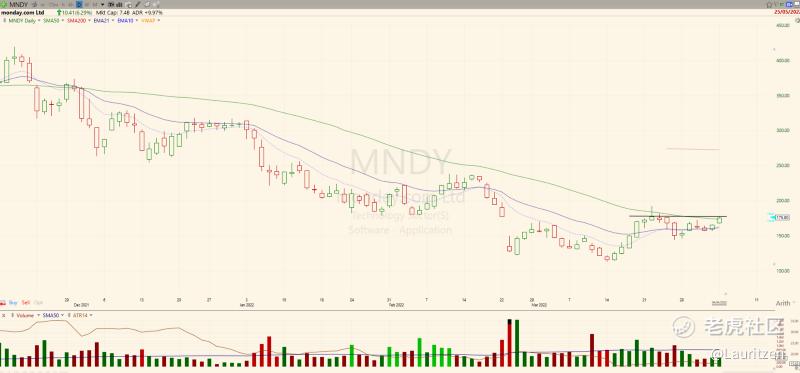 Monday ($$(MNDY)$) seems it made a bottoming pattern and now stays above the EMA21 in VCP formation. A breakout above the black line can work. Stop Loss: 5%.