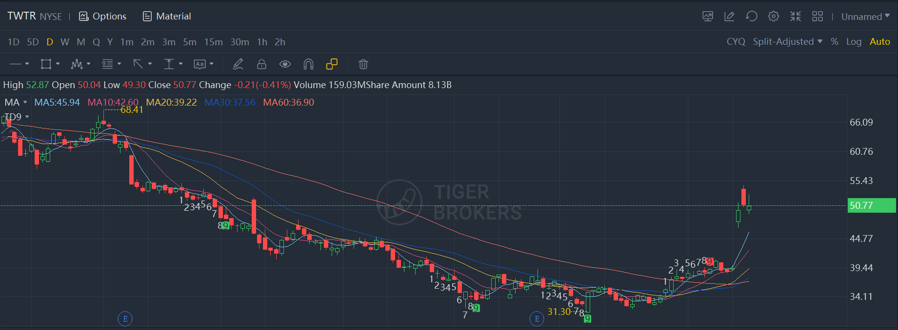 After Monday’s rally, $Twitter(TWTR)$market value soared from $31.5 billion to $40 billion, an overnight surge of $8.5 billion.