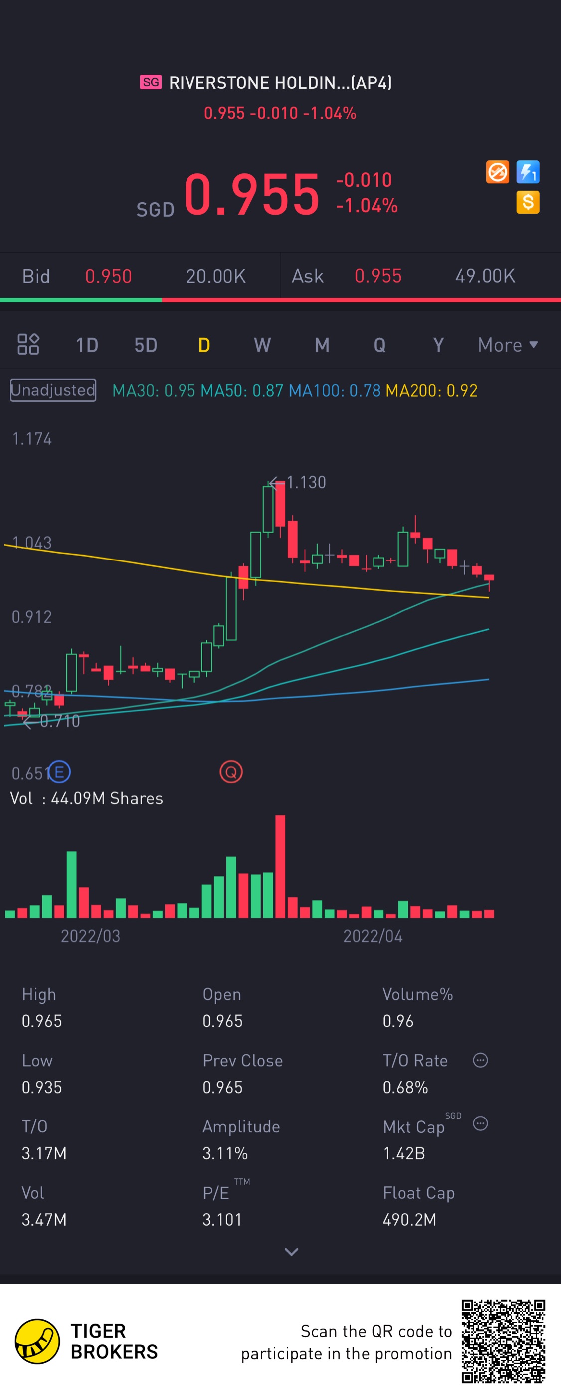 $RIVERSTONE HOLDINGS LIMITED(AP4.SI)$What are your views on this? 30MA cuts above the long term 200MA and today's prices bounces back up above the 30MA. Would the rallycontinue as we approaches the next dividend?Time will tell!