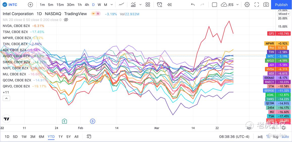 The top performer YTD is contract chipmaker GlobalFoundries (GFS) +10.74% increased in stock price, riding high on the huge pent-up demand and backlog of orders for semiconductors, amid a global chip shortage. Why did the rest of the semis stocks show up double digit % drop? It turned out prices have had a monstrous run in 2021, and all tickers dropped in tandem with the broader Markets, due to geopolitical conflict and rate hikes uncertainties in Jan to mid Mar 2022.
