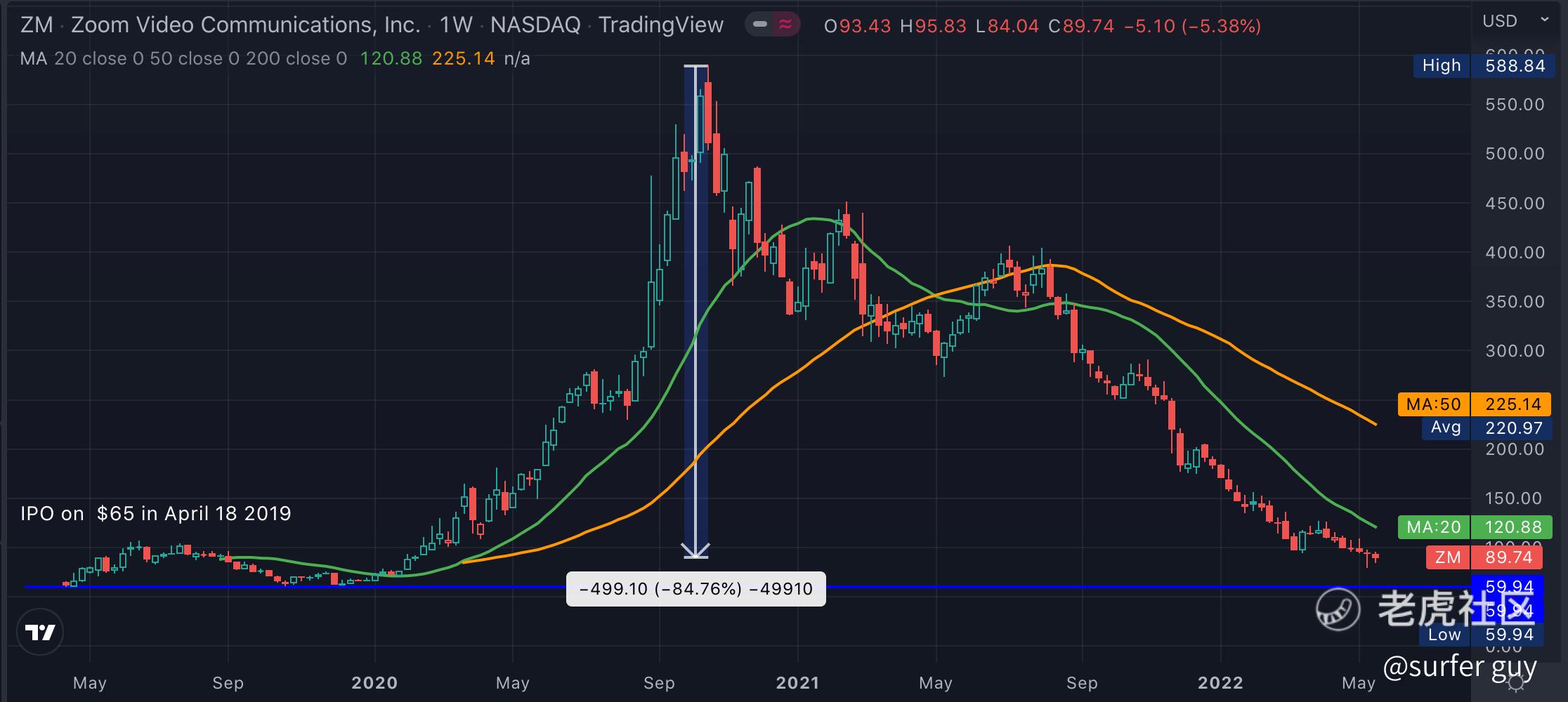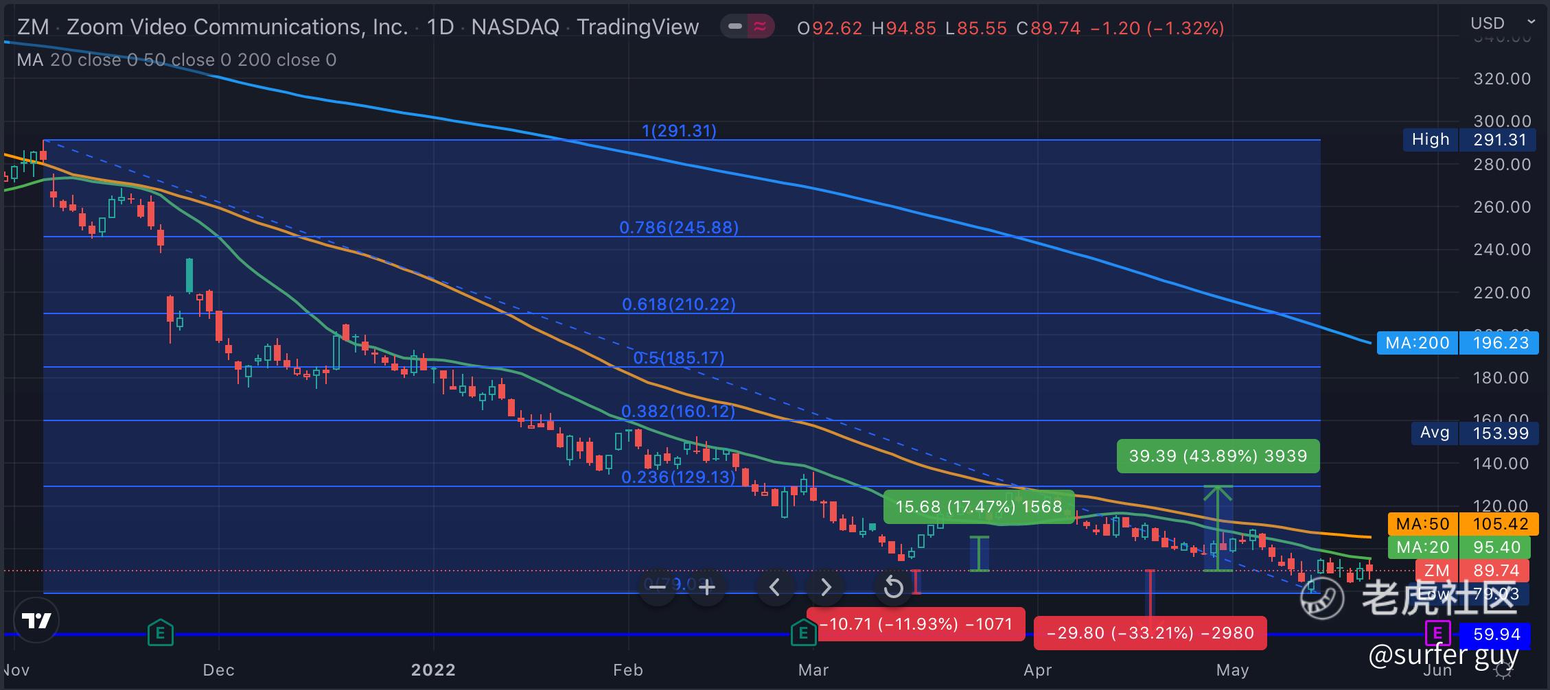High inflation and fear of rate hike affecting high growth company such as ZM exacerbated further sell-off in the stock since the start of 2022. With the stock now trading below its 20 and 50 MA and making lower highs and lower lows, it is in a confirmed downtrend. As of close of May 20, ZM stock price of $89.74 represents a drop of -84.76% from its ATH.