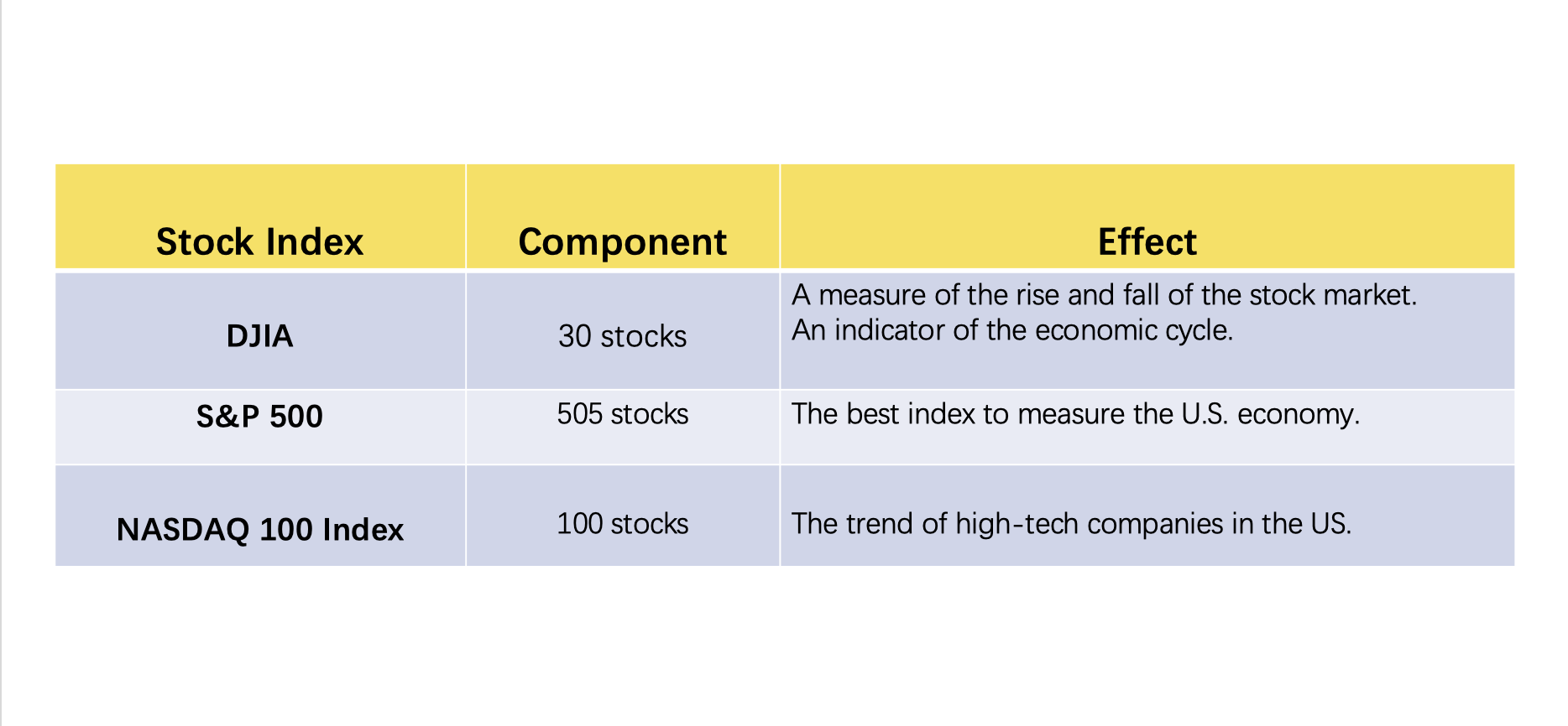 There are three major stock indexes in the U.S. stock market, namely the Dow Jones Industrial Average Index , the S&P 500 Index and the NASDAQ 100 Index.