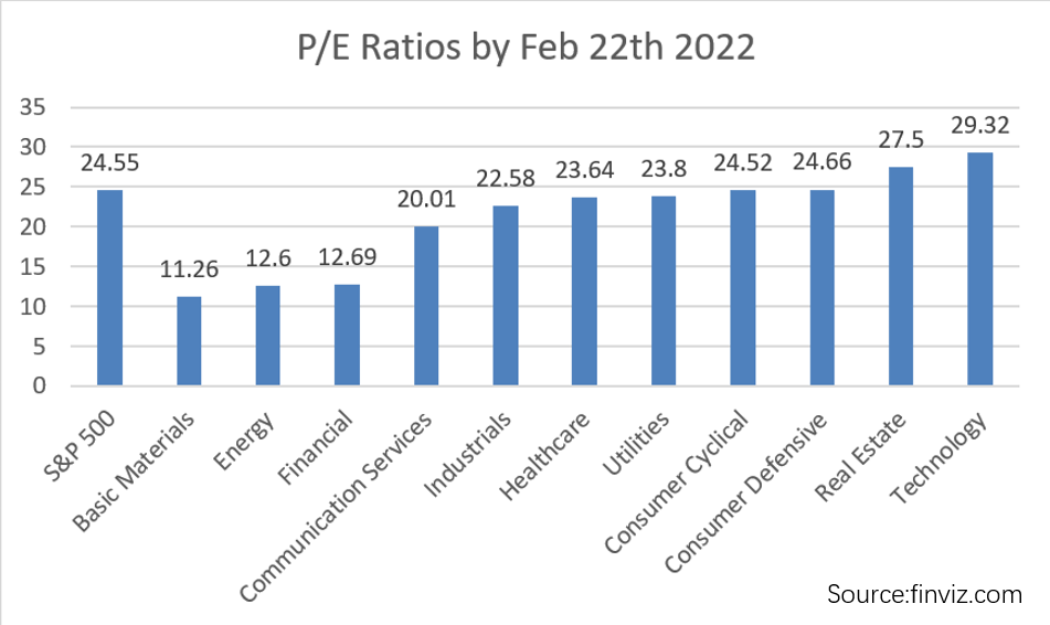 At present, the valuations (P/Es) of Basic Materials, Energy, Financial sectors are lower than the P/e of S&P 500 index, while Technology, Real Estate, and Consumer Defensive sectors' P/Es are higher than the S&P 500 benchmark's P/E.