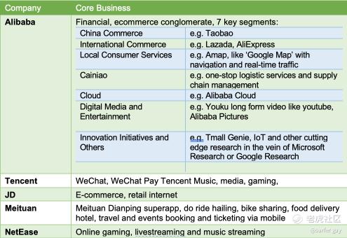 The five Tech giants are mammoth and have wide-moats in a diverse range of business areas, fuelled by online and Internet, which I think will not go away for decades to come. Their core business areas are summarised in the Table below.