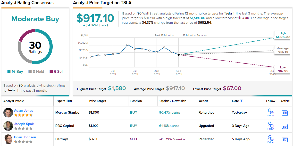 Overall, there’s a positive feeling on Wall Street about TSLA, along with some caution. The Moderate Buy consensus rating is based on 30 analyst reviews that include 16 Buys, 8 Holds, and 6 Sells. The average price target of $917.10 suggests an upside of ~34% from the current trading price of $683.