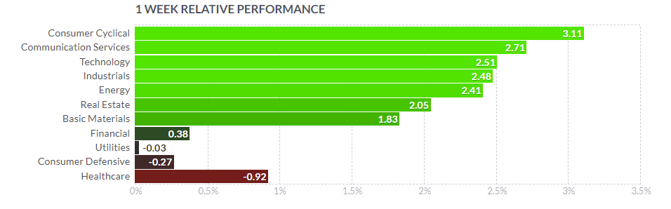 The consumer cyclical sector (+3.1%) was the best-performing sector followed by communication services (+2.7%) and technology (+2.51%). Health care (-0.91%) and consumer staples (-0.27%) sectors extended their losses for another consecutive week.