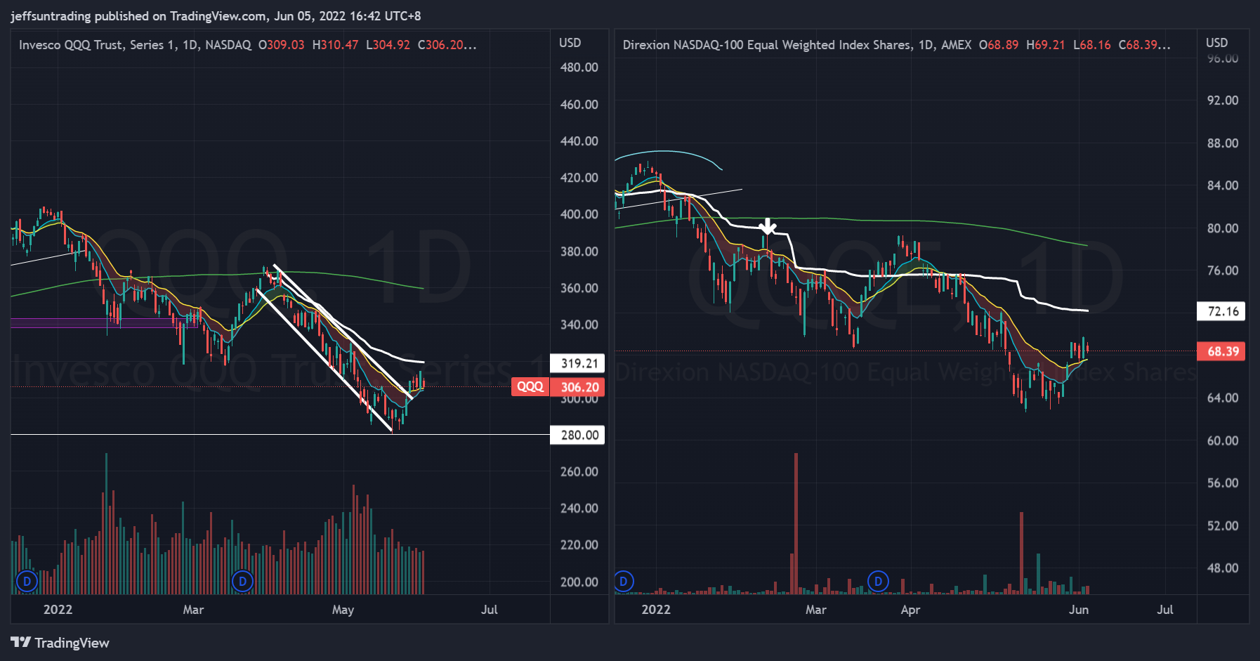 $QQQ (Nasdaq 100) vs $QQQE (Nasdaq 100 Equal Weight) – Further Extension of Bear Market Relief Rally
