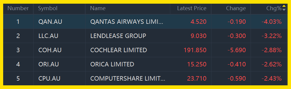 Top 5 lossers of ASX 200 companies are:$QANTAS AIRWAYS LIMITED(QAN.AU)$ ,$LENDLEASE GROUP(LLC.AU)$ ,$COCHLEAR LIMITED(COH.AU)$ ,$ORICA LIMITED(ORI.AU)$ ,$COMPUTERSHARE LIMITED(CPU.AU)$ .