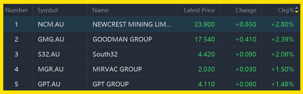 As of press time, Top 5 gainners of ASX 200 companies are: $NEWCREST MINING LIMITED(NCM.AU)$ ,$GOODMAN GROUP(GMG.AU)$ ,$South32(S32.AU)$ ,$MIRVAC GROUP(MGR.AU)$ ,$GPT GROUP(GPT.AU)$