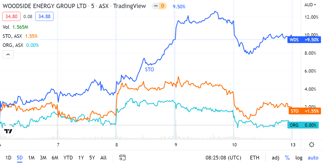 $WOODSIDE ENERGY GROUP LTD(WDS.AU)$ ,$SANTOS LIMITED(STO.AU)$ ,$ORIGIN ENERGY LIMITED(ORG.AU)$ are larger stocks of Energy Sector, weekly performances are 9.5%, 1.55%, and 0 change respectively.