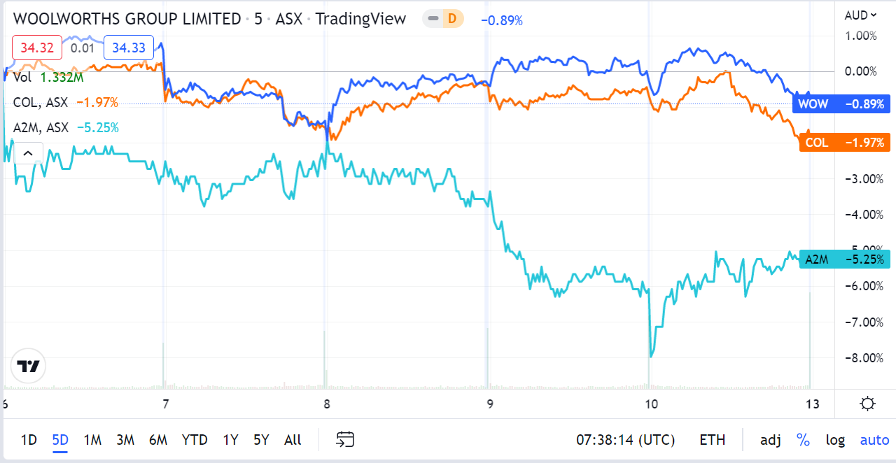 $WOOLWORTHS GROUP LTD(WOW.AU)$ ,$Coles Group(COL.AU)$ ,$A2 Milk(A2M.AU)$ are larger stocks belong to Consumer Staples Sector. The past week see declined around 1%~3%.