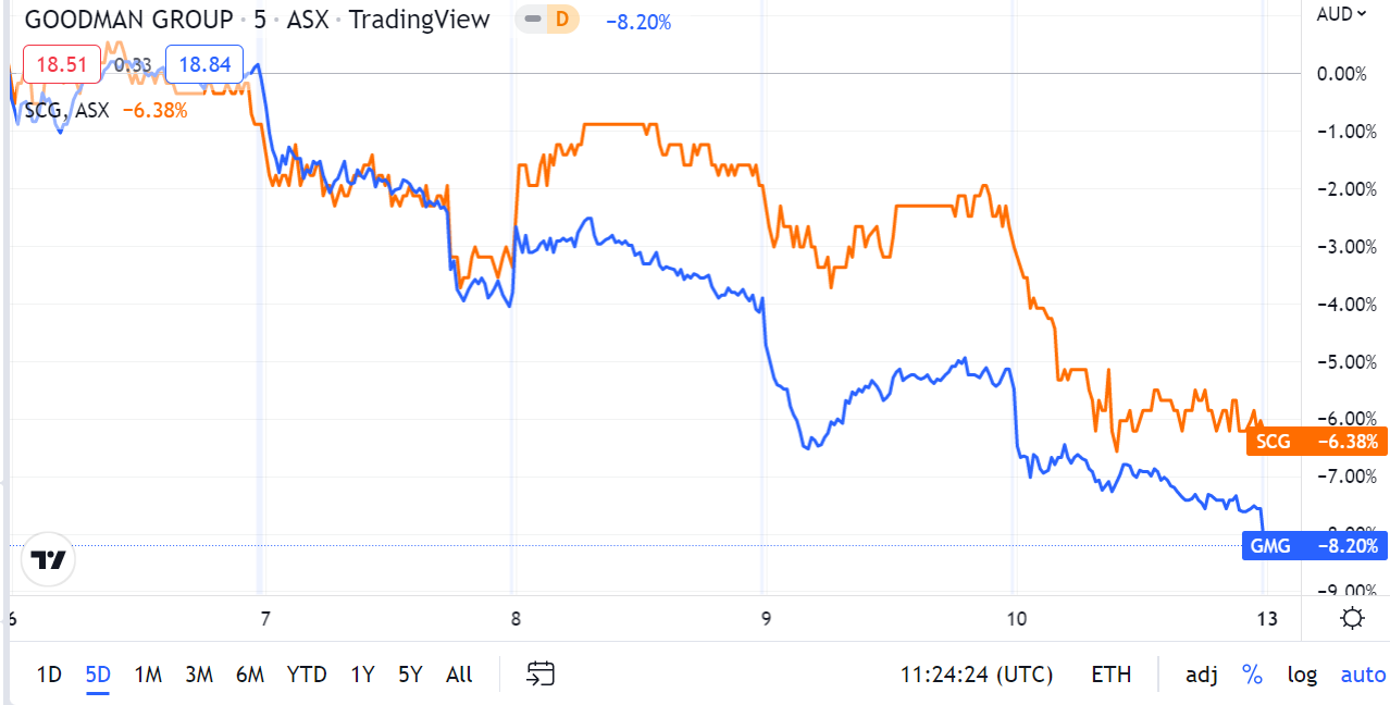 $GOODMAN GROUP(GMG.AU)$ , $Scentre(SCG.AU)$ are stocks from Real Estate Sector, SCG declined 6.38% weekly, GMG declined 8.2%. Both are top ASX REITs on investors.