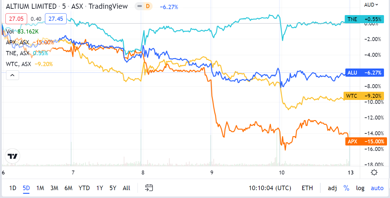 $Altium(ALU.AU)$ ,$Appen Ltd(APX.AU)$ ,$Technology One(TNE.AU)$ ,$Wisetech Global(WTC.AU)$ are stocks belong to Information Technology Sector. APX.AU dropped the most around 15%, WTC.AU declined about 9%, ALU.AU lost 6% weekly, only TNE.AU gain 0.55%.