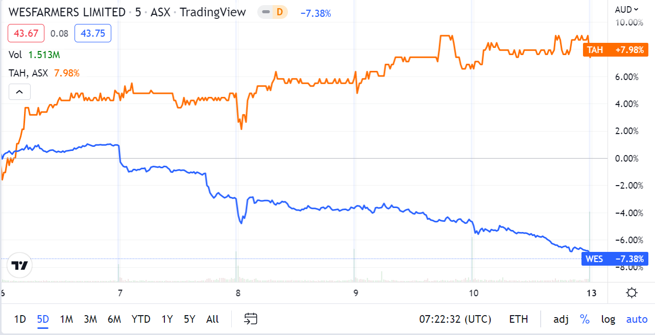 $WESFARMERS LIMITED(WES.AU)$ , $TABCORP HOLDINGS LIMITED(TAH.AU)$ $ are in Consumer Discretionary Sector, they've see -7.38% and 7.98% increase respectively this week.