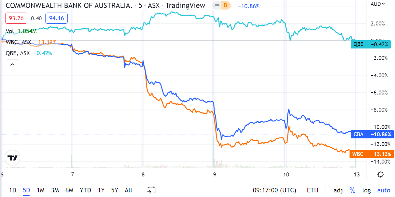 $COMMONWEALTH BANK OF AUSTRAL(CBA.AU)$ ,$WESTPAC BANKING CORPORATION(WBC.AU)$ ,$QBE INSURANCE GROUP LIMITED(QBE.AU)$ are 3 Financial Sector companies, WBC.AU and CBA.AU declined more than 10% in this week , and QBE slightly decreased 0.42%.