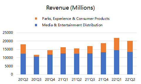 - Revenue of the media and entertainment was US $13.89 billion, while revenue of theme parks and experience was 6.65 billion US dollars, compared with the same period of last year.Higher than expected $6.12 billion;