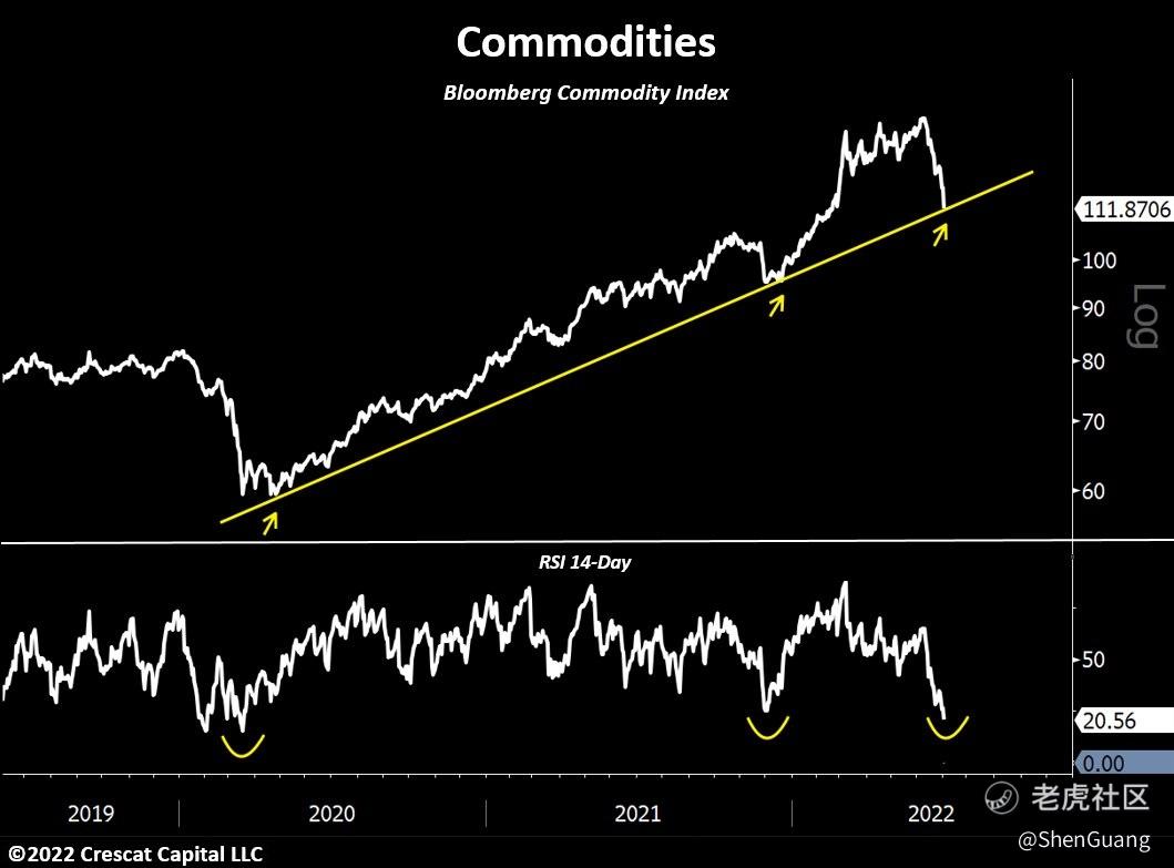 Also, there is an interesting effect on commodities due to the fading growth outlook: the Bloomberg Commodity Index - which tracks energy, grains, industrial metals, precious metals, softs (coffee, sugar and cotton) and livestock - has been falling while showing a steady uptrend: