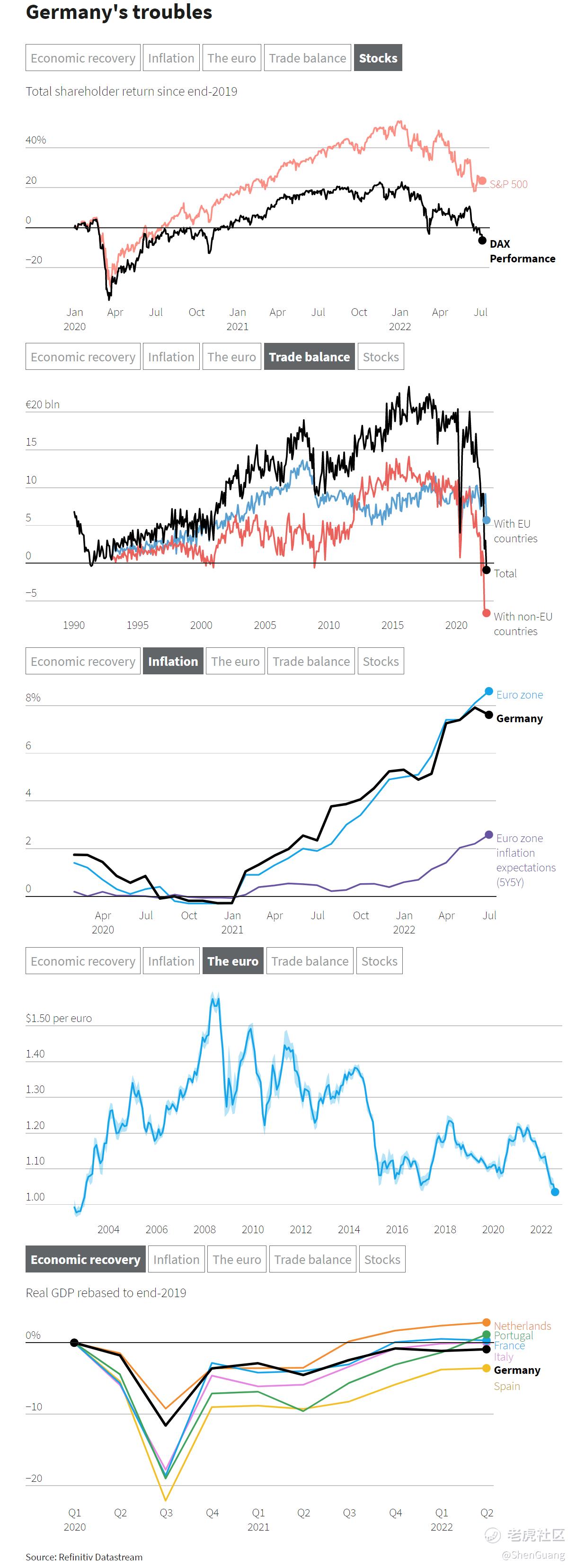 There are a number of reasons for this: firstly, the post-pandemic recovery has seen Germany lagging behind other top Eurozone economies. Secondly, the fall of the Euro versus the US$ has impacted valuations, Thirdly, Germany's balance of trade is precarious even within the Eurozone and finally, inflation is sky-high in the Eurozone.