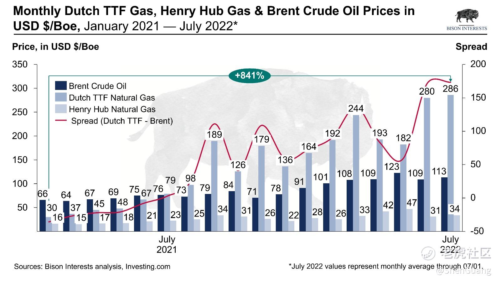 With regard to gas imports, European countries have two key problems: firstly, there aren't nearly enough sites open for natural gas extraction within their sphere. Secondly, given the pipeline from Russia, there aren't nearly enough terminals for receiving imported gas from outside of Russia. As a result, the spread between gas priced in Europe and gas priced in the U.S. (which has a number of sites within its territory) is growing steadily wider: