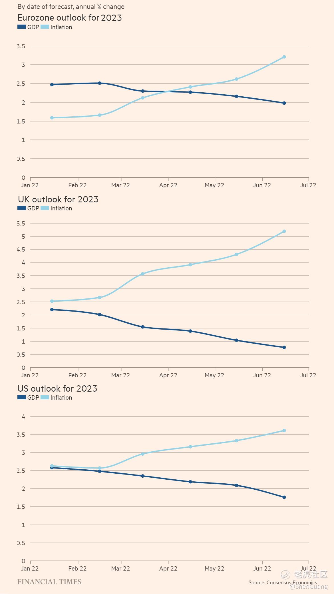 Given rising inflation (both current and prospective), economists' consensus on GDP/economic growth in 2023 for both U.S. and Europe have dramatically changed over the past one month: