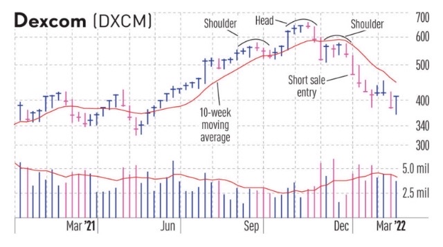 Last year, Dexcom (DXCM) formed a head with shoulders that preceded a drop of nearly 60% from the top of the head to the bottom in May.