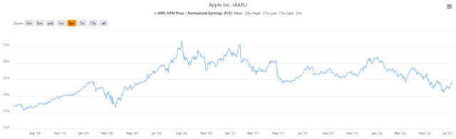 The average multiple for the past three years has been 26X forward earnings, as Apple has been assigned a much higher multiple recently due to its burgeoning services business producing high-margin recurring revenue. That's fine and I don't have a problem with that sort of multiple re-rating when revenue mix changes. However, at 24X forward earnings for a company with high-single-digit growth potential at best, and low-single digits at worst, it's not a value stock, either.