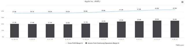 There are other ways to grow EPS besides revenue, however, with margins being the second one. Below we have trailing-twelve-months gross margins and operating margins for some historical context.