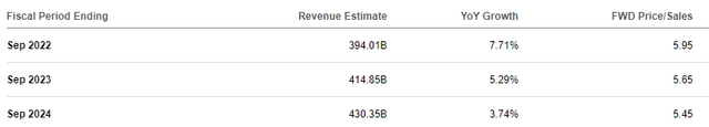 Revenue estimates show ever-declining rates of growth in the coming years, with 2024 looking at a utility-like 3.7% growth rate. That's just not going to cut it, but it's understandable. This company is the most successful in the global smartphone market, so there simply isn't room to take meaningful share as long as Android is around. The other product lines the company has aren't going to fuel meaningful growth either because, in comparison to iPhone, they just don't matter that much. I know Apple has other great businesses, including services, which support extremely high-margin growth. But Apple is about the iPhone, primarily.