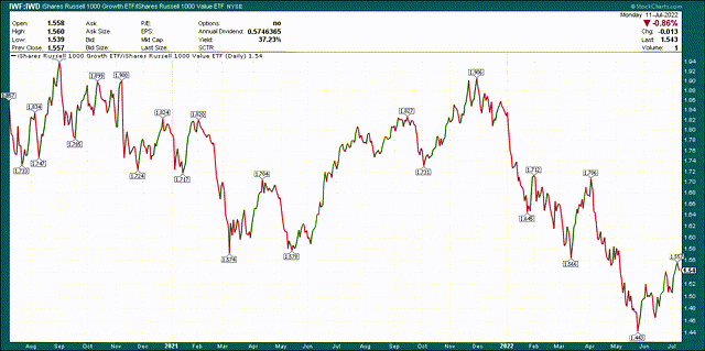 So far this year, value has trounced growth, as we can see below with the growth-to-value relationship in stocks.