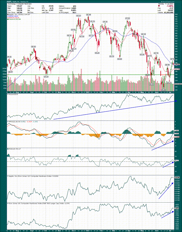 Finally, the company's peer group is flying against the broader market, and Apple is outperforming the peer group. That's an ideal scenario and another feather in the quill of the bulls.