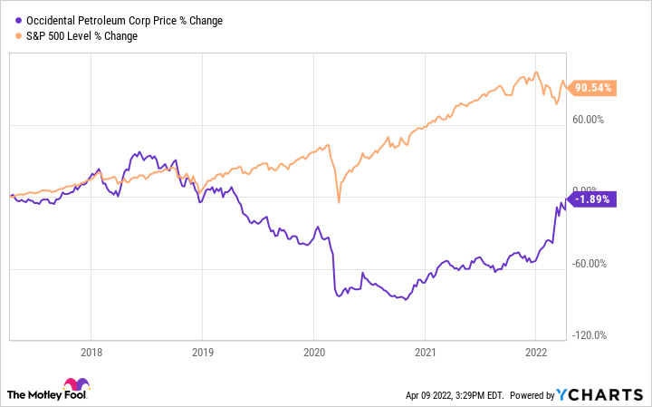 Even with this year's monster rally, Occidental's share price today is almost identical to where it was five years ago. In fact, it's actually down 2%. Compare that performance to the S&P 500, which has returned 91% over the past five years.