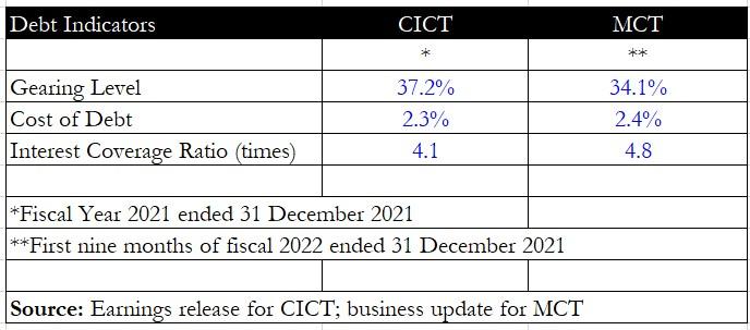 Both REITs have nearly the same cost of debt at around 2.3% to 2.4%, but MCT has a slightly higher interest coverage ratio of 4.8 times.
