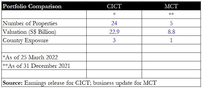 In terms of country exposure, CICT has properties in three countries — Singapore, Germany, and Australia, while MCT only has properties in Singapore.