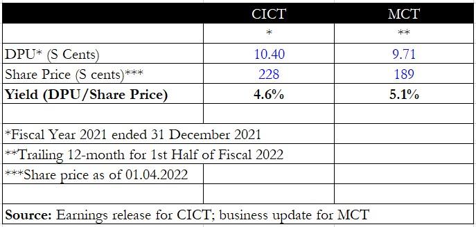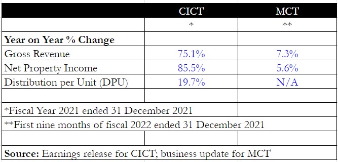 Also, CICT’s fiscal year-end is 31 December while MCT’s is 31 March; hence there is no DPU information for the first nine months of fiscal 2022 for the latter.