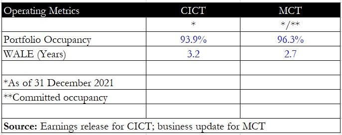 MCT had a higher committed occupancy of 96.3% as of 31 December 2021, compared with CICT’s occupancy level of 93.9%.