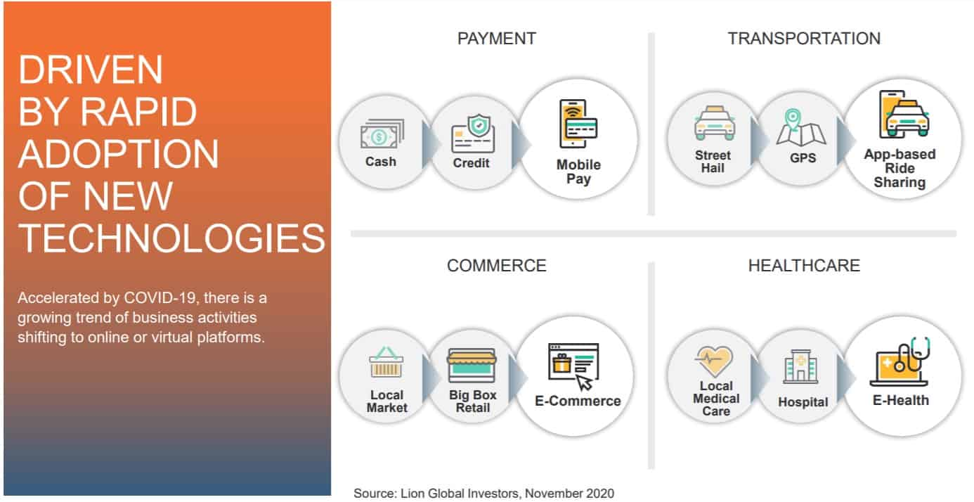 We are all very familiar with the NASDAQ which is home to global technology companies such as Amazon, Alphabet, Apple and Facebook. These are companies that originated and headquartered in the US. The equivalent of these companies in the East can be found in the Hang Seng TECH Index, which represents the 30 largest technology companies listed in Hong Kong that have high business exposure to technology themes (Cloud, E-commerce, Digital, Internet, Fintech). These are exciting growth sectors to be exposed to as Covid-19 had accelerated the rapid adoption of new technologies ranging from payments, commerce to healthcare as shown in Diagram 1.